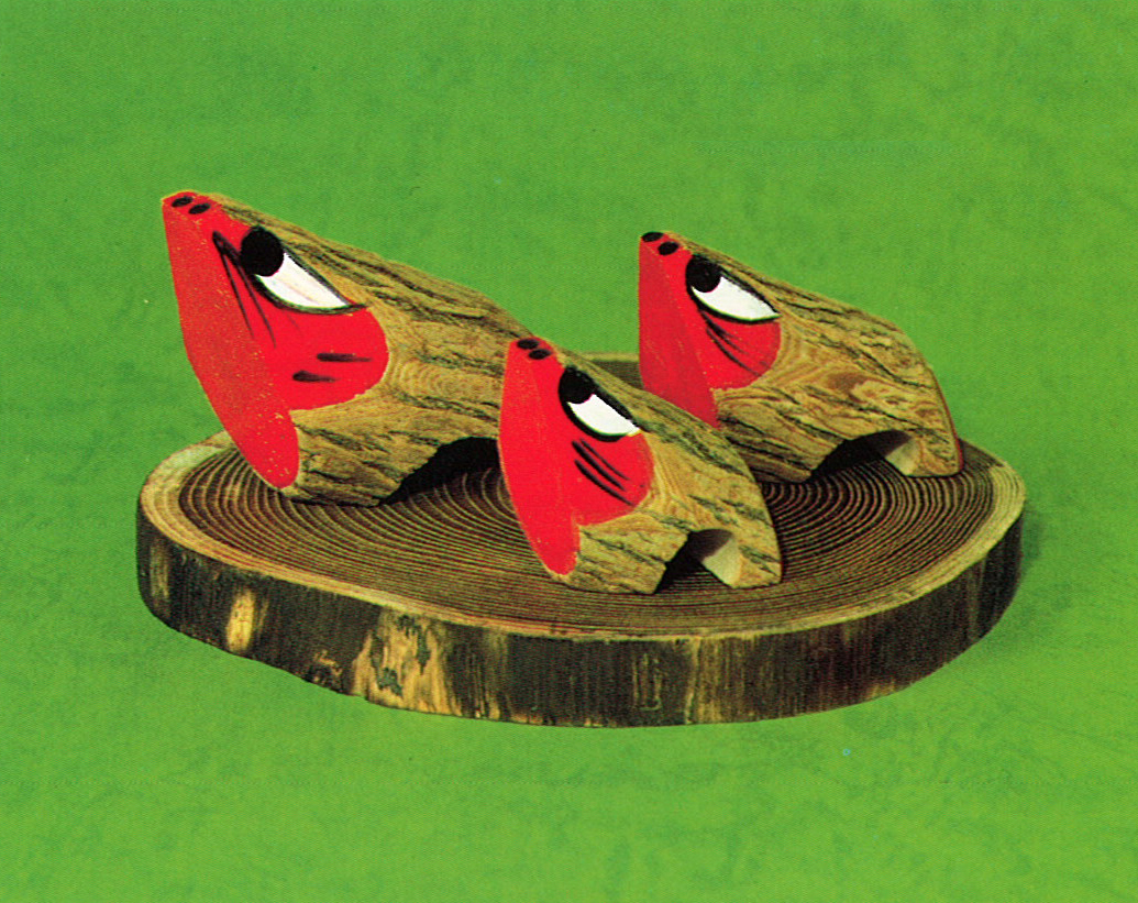 山椒の気の肌合いを生かして。シンプルな色と線で造形した九重の十二支。これは、その中の“いのしし”である。(昭和58年 九重町大字田野『九重民芸』制作)