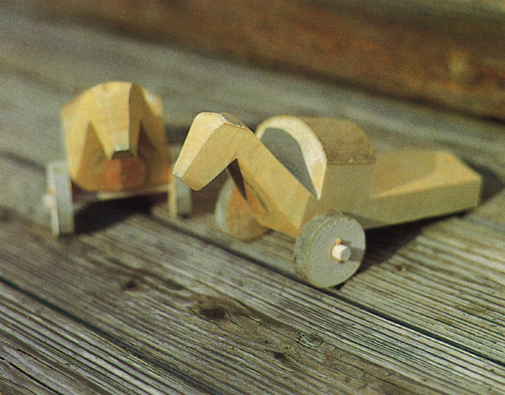 玖珠町北山田で19世紀後半から作られていたものを、故中村利市さんが戦後に復刻した。原木はホウノ木。白木のままで、背中に樹皮を残した素朴さに人気が高い郷土玩具である。