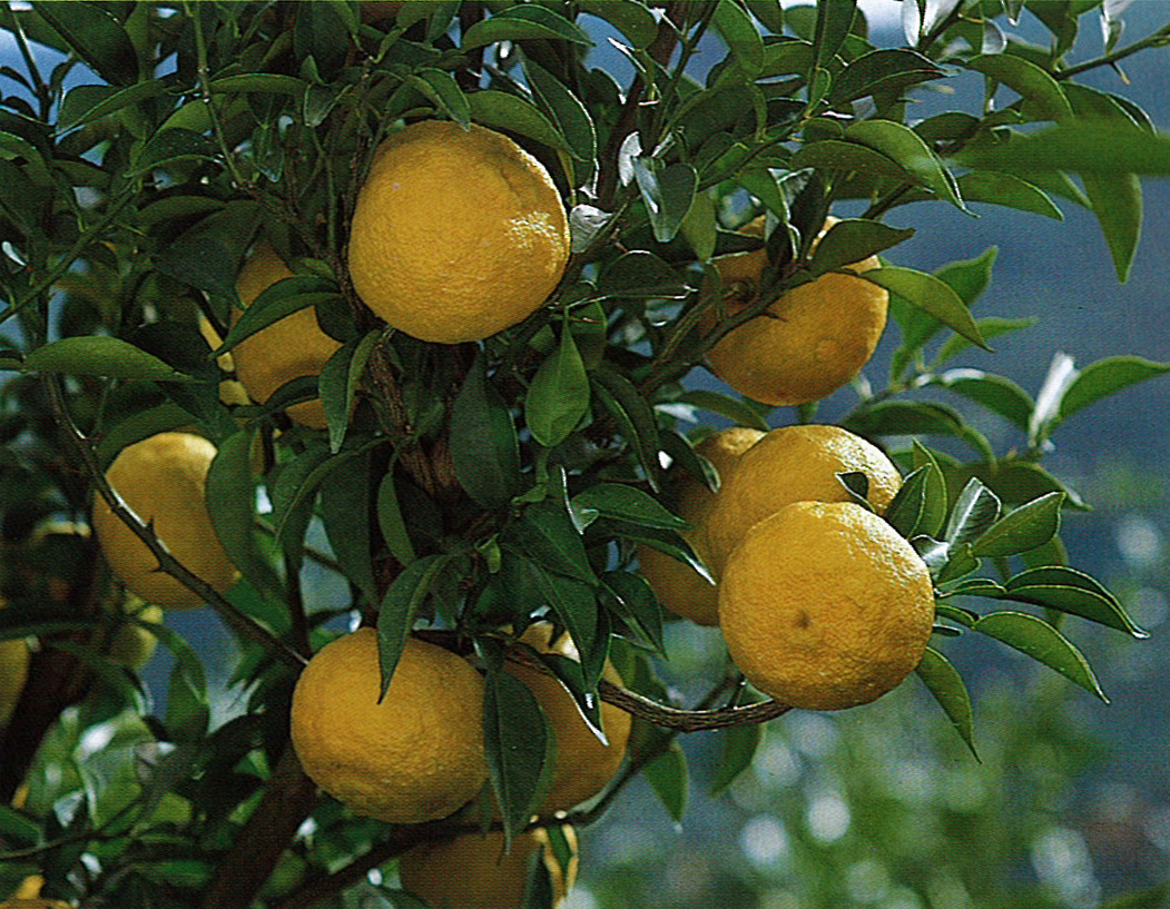 かぼすと並んで県特産の天然果実酢ゆず。独特の香りとさわやかな酸味が、晩秋の味覚をひきたたせる。果皮は吸物のすいくちや菓子に利用され、上品な風味が愛好されている。中国揚子江上流が原産で、日本へは奈良時代に渡来し広く栽培されてきた。当時の大分県は全国3位の栽培面積(146ha)があった。なかでも一村一品作目として力をいれていた宇佐市院内町は、生食用のほか味噌漬、ジャム、ゆずごしょうなどの多彩な製品に加工し好評を得た。
