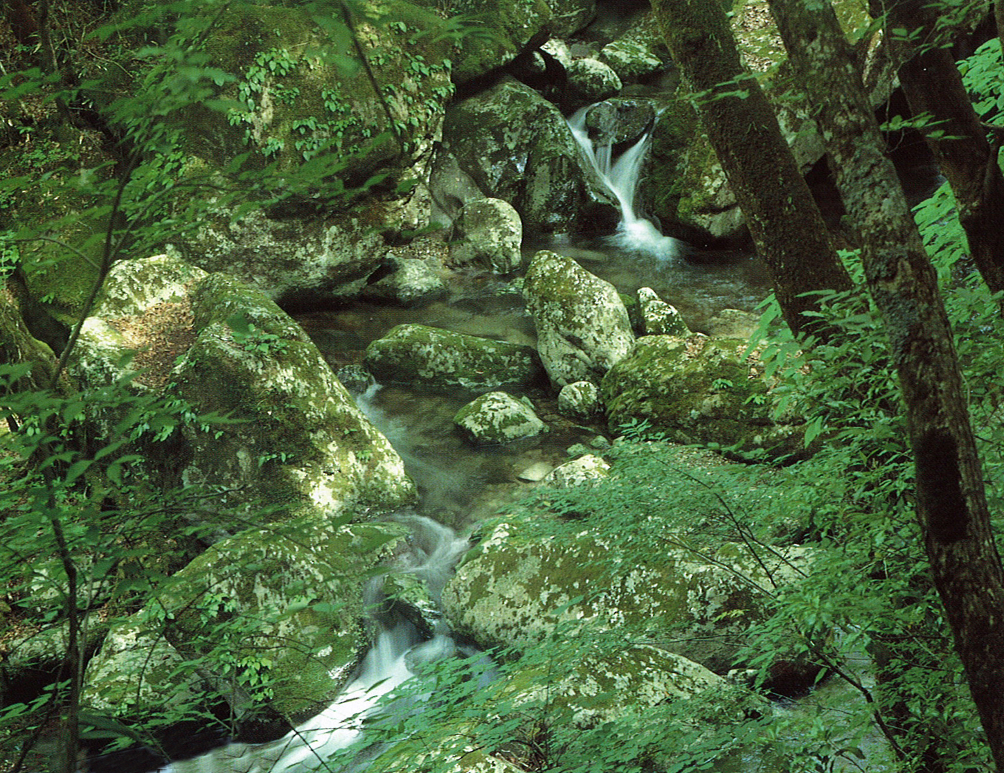 九州自然道にもなっている神原からの祖母山登山道を登ると、原生林の間から渓谷がチラホラと姿を見せる。その昔、修験者がみそぎをして山に登ったといわれる「御社(おやしろ)の滝」をはじめ、渕あり瀬ありの変化に富んだ景観が自然の造形美をつくり出している。