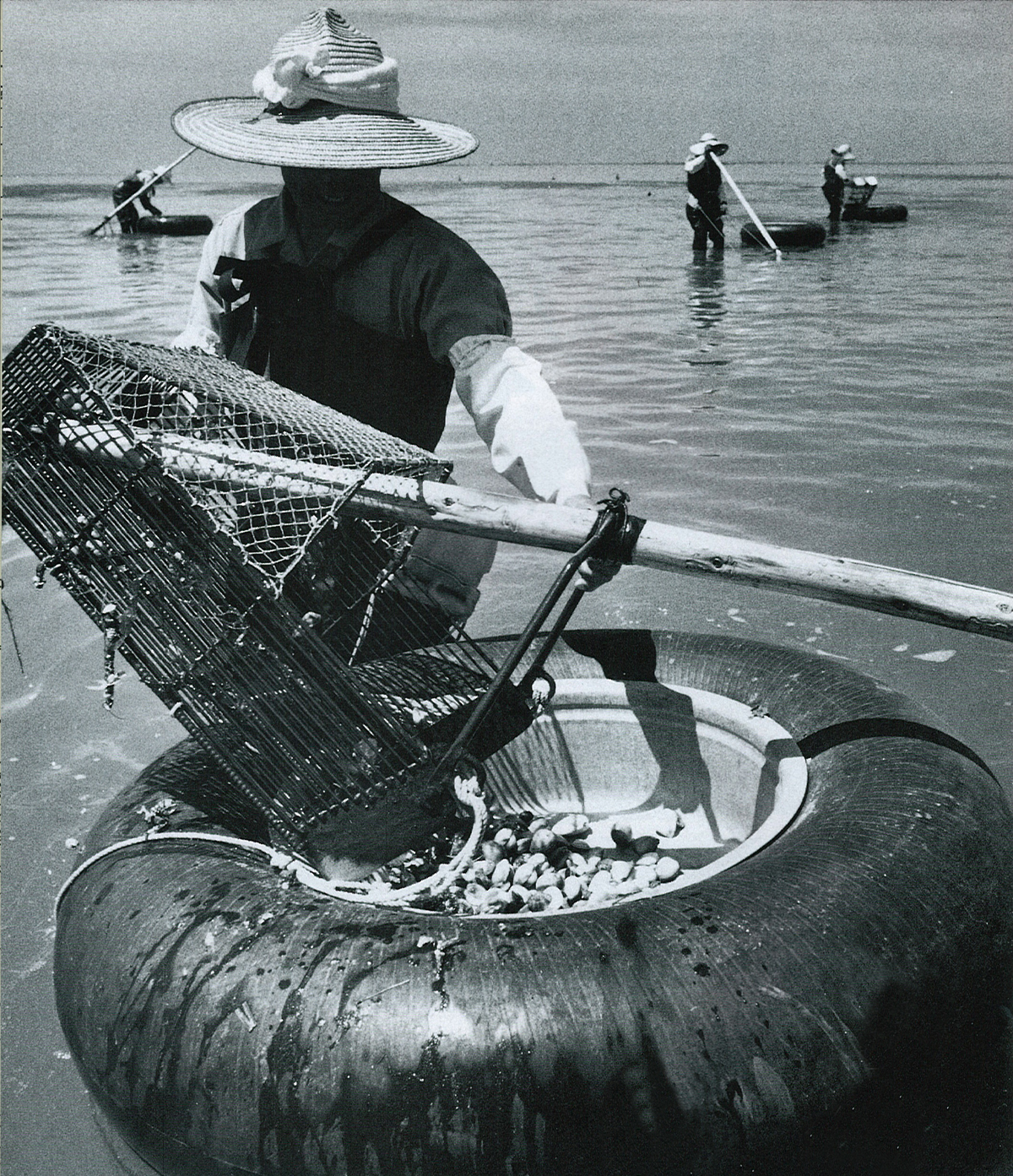 採貝漁業は、ノリ養殖とならんで豊前海干潟漁業のエース。広大な干潟のほぼ全域に、たくさんの二枚貝や巻貝が生息している。中でも、アサリ、ハマグリはその代表。貝類の捕獲量は、豊前海で約3万トンもある。貝を取る道具は「ジョレン」。鉄製の枠は重さが5~6キロあり、引き綱を腰に回し、丸木の柄を上下しながらひざあるいは胸まで海につかっての作業は重労働である。