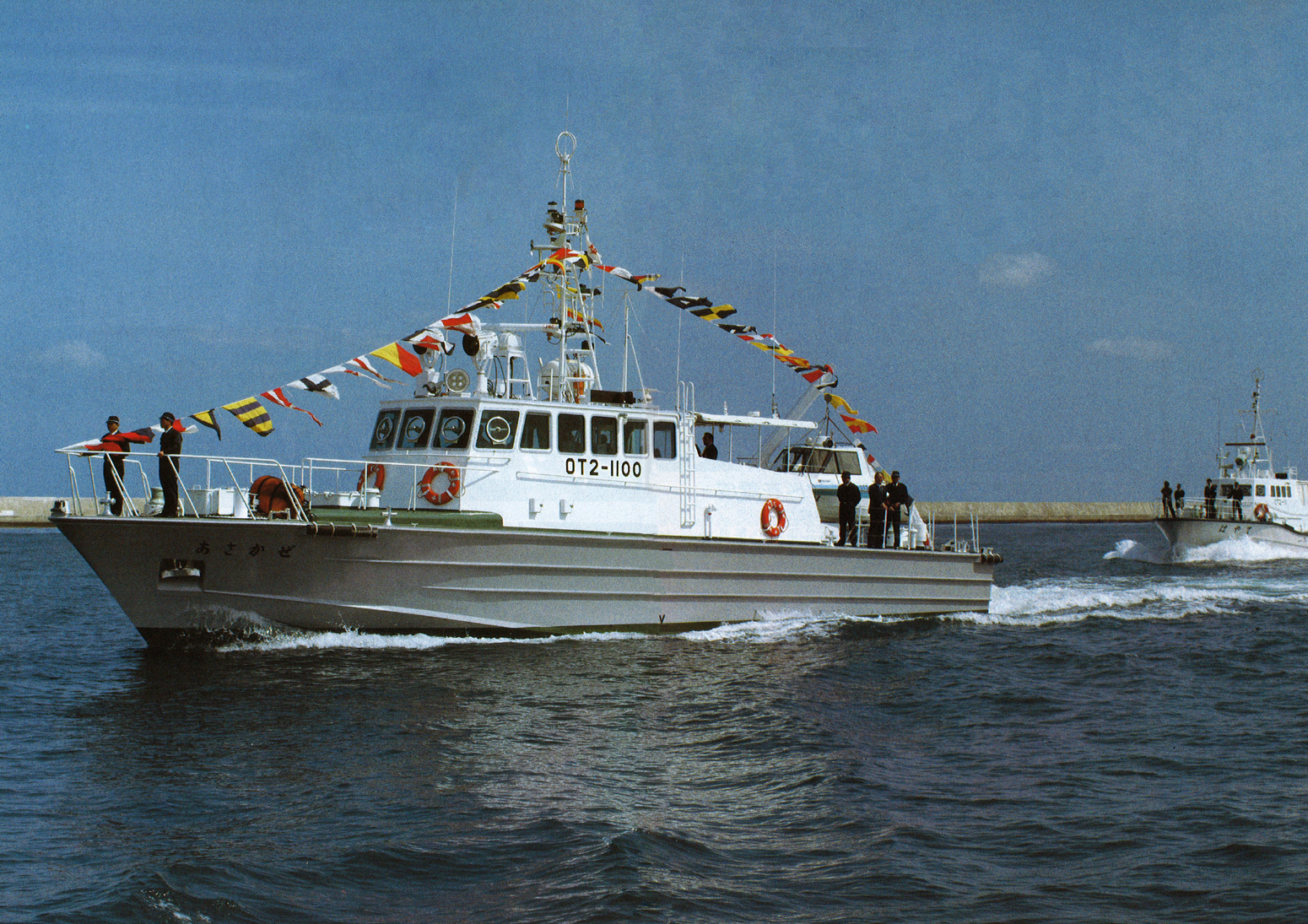 大分市の大在公共埠頭で行われた、アルミ製漁業取締船「あさかぜ」の竣工式の様子。「あさかぜ」は、三浦高速艇研究所が設計し、臼杵アルミ造船が建造した高速艇。