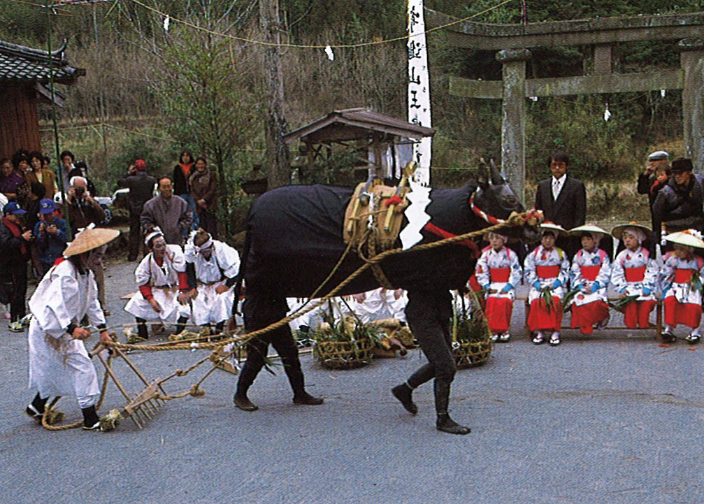 国東市安岐町の諸田山神社に伝わる「御田植祭」は、文政4(1821)年に杵築市の奈多八幡より伝えられ、以来毎年旧正月15日に諸田山神社の境内で行なわれている。この祭事は、農作物の豊穣と氏子の繁栄を祈る田植え前の予祝行事。あらかじめお祝いをすることにより、目的がかなえられるという考えに基づいている、境内にしめ縄で囲まれたか神田が作られ、一角にある「鬼」とかかれた的を射て行事が始まる。畦(あぜ)塗り、代(しろ)かき、地ならし、種まきなど稲作の順序に従ってユーモアたっぷりに演じられる。代かきでは張り子に牛が駄使いの意のままに動かず爆笑を買う。小学生の男子が女装して早苗を植える。最後に「うなり」と称せられる女形が登場し、急に産気づく。赤布の人形であれば女の子が、白布の場合は男の子が、その年の氏子に多く生まれるといわれ、村人の安産と繁栄を祈願する。豊かなみのりを願うおおらかで愉快な行事として知られる。