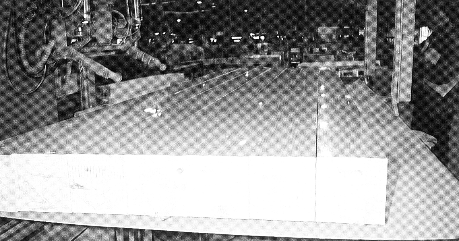 当時、佐伯市宇目の面積は266平方キロ。そのうち93%、249平方キロを林野で占めた。林業は町の重要な産業であった。佐伯市宇目林研グループは、町のふるさと創生事業の一環として、大阪市場や奈良県吉野などを訪れた。写真は奈良県にある集成材工場。