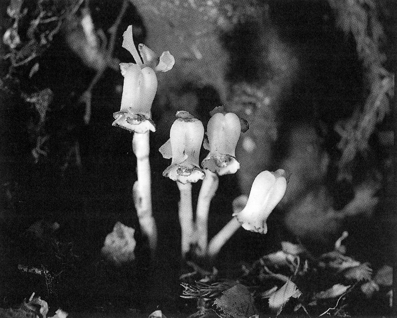 平成2年のある日、暮雨(くれさめ)の滝近くの林道で一休みし、道をそれたところで『ギンリョウソウ』をみつけた。薄暗い樹の根元に眼を凝らすと、落ち葉の間から頭をもたげている可憐な姿であった。乳白色の幻想的な姿は、海底に潜むうつぼを思わせた。