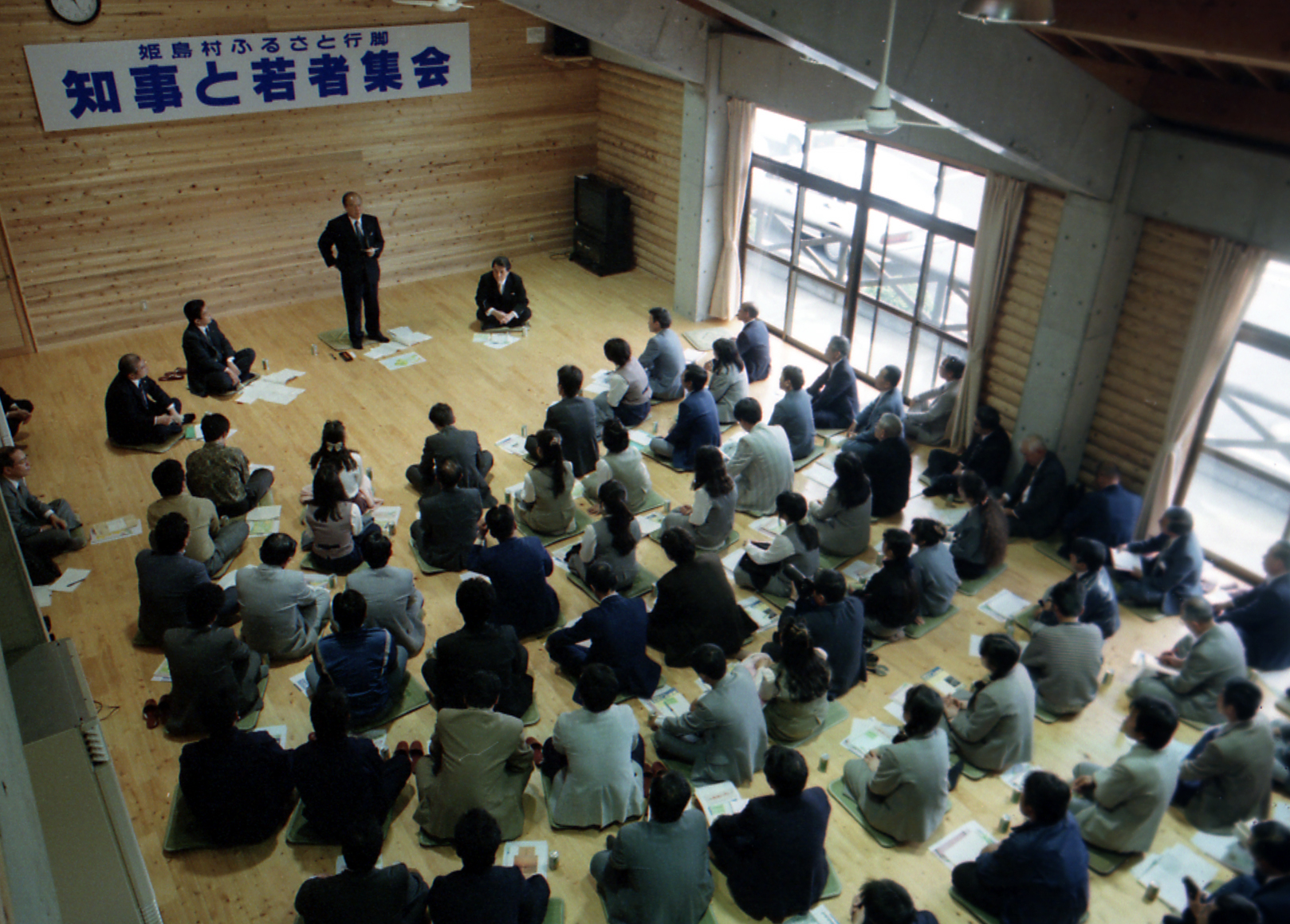 地域からの発想や夢を県政に反映させることを目的に、知事と自由に意見を交換する「豊の国ふるさと行脚」の第1回が、平成3年5月15日姫島村の若者宿「城山」で開かれた。漁業や商工業に従事する若者を中心に75人が出席した。漁業立村の姫島村の会場にふさわしく、海洋牧場の造成や海の汚染を防止するための下水道の整備など、これからの村づくりについて活発な意見が出された。