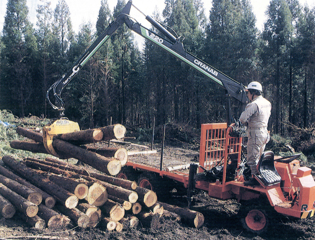 県では、林業労働力の確保と低コスト林業推進のため、平成3年10月31日に「財団法人森林整備センターを発足させた。これにともない、由布市湯布院町の県林業研修所では高性能林業機械オペレーター養成研修が行われた。写真は杉の積込、荷おろしがらくにできるフォワーダー実習のようす。