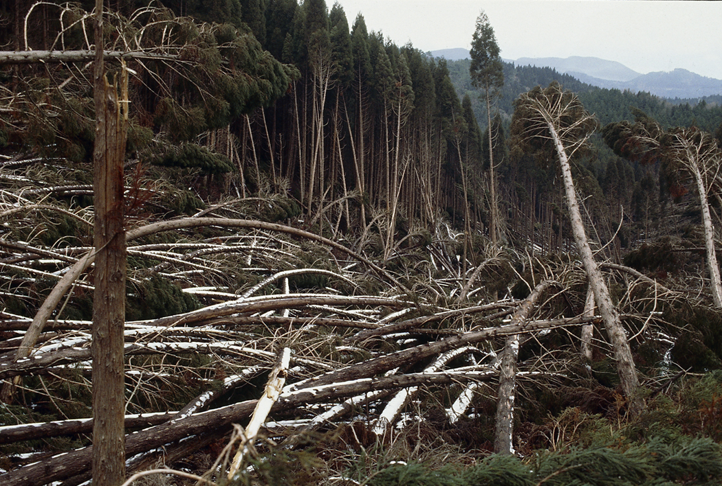 平成3年9月末の台風19号で大きな被害の出た、県西・北地域の森林災害の復旧の応援に、県外から209人の救援隊員がかけつけた。