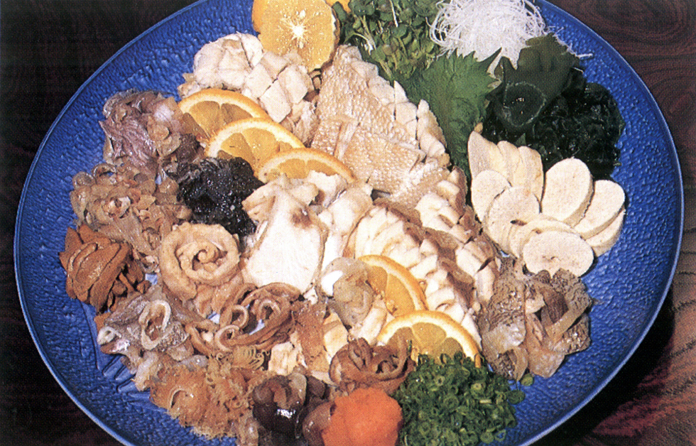 久住、大船、祖母、傾などの山々に囲まれた城下町竹田市。岡藩主中川久清治政の頃(1615~1681年)海から遠く離れたまちでも魚をおいしく食べる、生活の知恵として生み出されたのが頭料理。身だけでなく、頭、エラ、アゴ肉、皮などあらゆる部分を各所に応じた切り方で調理し、湯引きする。材料はニベ、アラ、ハタ、クエ、マスなどの白身の魚。季節の野菜を添えて竹田特産のカボスで作った二杯酢、三杯酢でいただく。一度食べたら忘れられない独特な味だ。