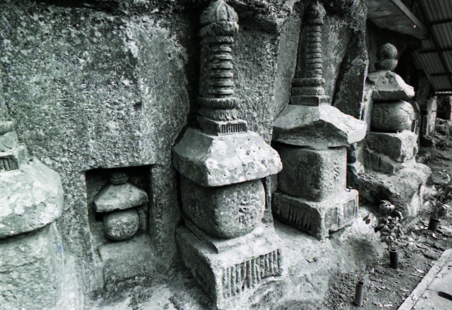 鎌倉時代末期から南北朝時代の作といわれる磨崖石塔群。周辺には、横穴古墳群があり、土師器、須恵器などが出土している。