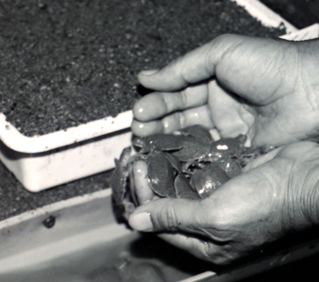 当時、スッポンの養殖量が全国一の大分県。スッポンの養殖を技術の開発や指導の面で支えるのが宇佐市安心院町にある県内水面漁業試験場であった。平成4年に開業25周年を迎えた。写真はふ化直後のスッポン