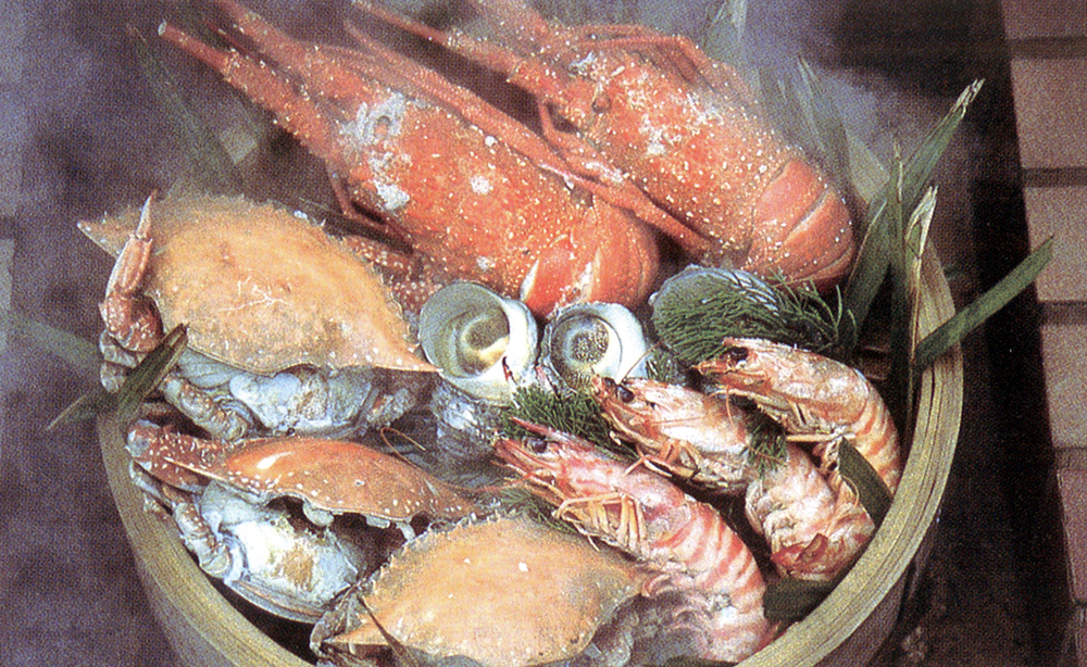 豊の国おおいたの海の幸・山の幸を、地底から噴き上がる天然の噴気で一気に蒸し上げたものが、別府名物の「地獄蒸し料理」。噴気の上がる釜の上にナベ・ザル等を置き材料を入れる。車えびにカニ、サザエ、とうもろこし…。塩分等を含んだ天然の噴気で、色あざやかな蒸し上がり。材料の風味もそのまま活かされ、素朴な色に仕上がる。当時、地獄蒸しプリンなども登場し、若者の話題をよんだ。