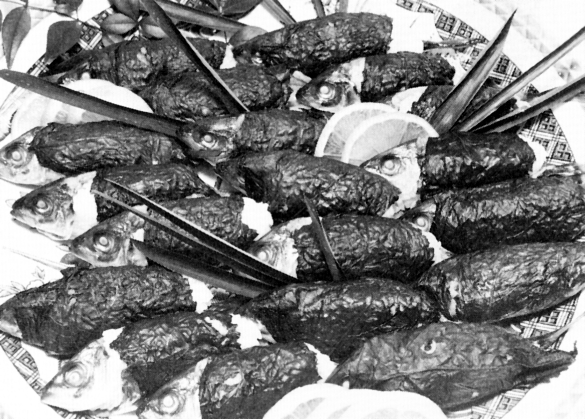 県南グルメ開発試食会が平成5年1月30日、佐伯市弥生中央公民館で開催された。これは、県南地域の観光をより魅力的なものにするために、地域の郷土料理のおいしさをアピールしていこうと県南グルメ開発推進協議会が主催した。シソを巻いた丸寿しはあっさりした味つけ。