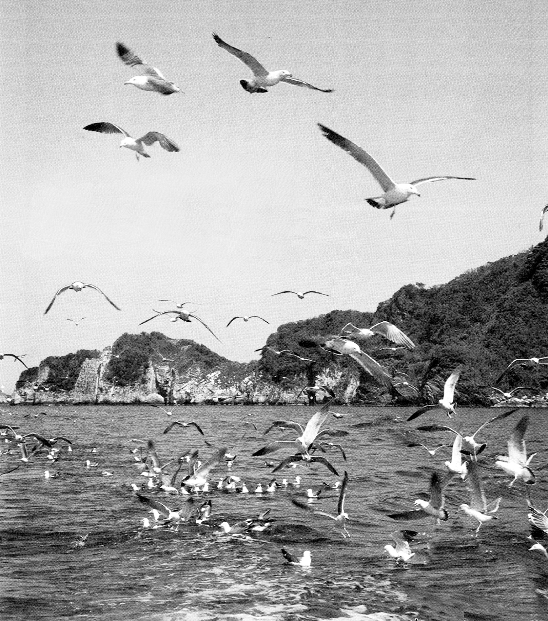 豊後水道の孤島、高島の東北端、絶壁の浸蝕岩を背し、ミャーミャーという奇声を発して乱舞する数千羽のウミネコの光景は壮観。人を寄せつけない絶壁に巣をつくるウミネコは、まだ寒い三月から四月に島にやってきて、五月ごろ産卵し、雛が成長する八月上旬、また旅立っていく。