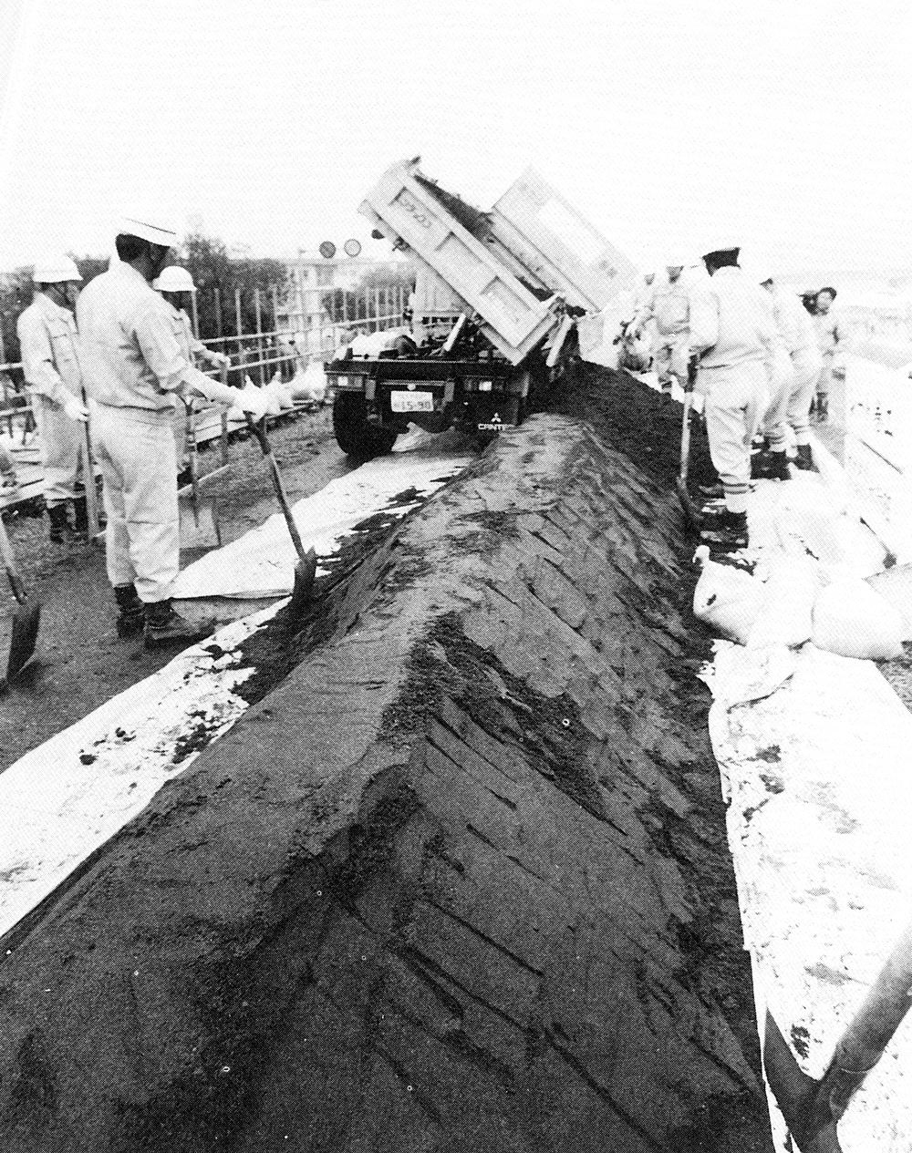 当時、梅雨期を控え、洪水時における関係機関の連携と水防体制の強化、水防技術の研鑽、水防に対する住民の理解を深めることなどを目的に、「平成5年度大分川・大野川水防演習」が同年5月18日、大分市畑中の大分川左岸で行われた。「シート巻き工」、堤防の上に防水シートを敷き、盛り土をして、シートで多い、堤防を高くする。