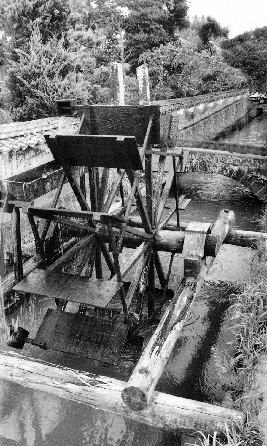 緒方川を中心に開けた肥沃な緒方平野は、「水枯れを知らない地」、「緒方五千石」と呼ばれてきたように、県下でも有数の米どころ。その礎となった水路が平野部から山間部にまでくまなく開削されている。中でも原尻の滝の上流から水をとり、緒方平野を流れる緒方井路は、江戸時代に岡山藩の儒学者能沢藩山の指導により開削された。当時としては卓越した技術が施され、千分の一勾配をもって町内をゆるやかに流れている。井路のいたるところに水車がみられる