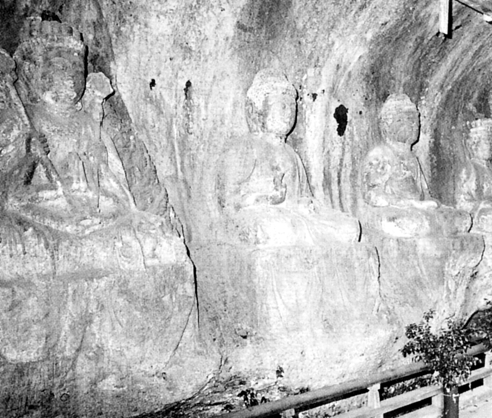 大野川流域は優れた磨崖仏が多いことで知られている。中でも豊後磨崖仏を代表する傑作として知られているのが菅尾石仏(国重文)。豊後大野市三重町宇対瀬の田園風景を見下ろし、西方に臨んで端然と刻まれた五体の石仏は、左から千手観音、薬師如来、阿弥陀如来、十一面観音、多門天。藤原時代末期の作品と推定されているが、作者は不明である。