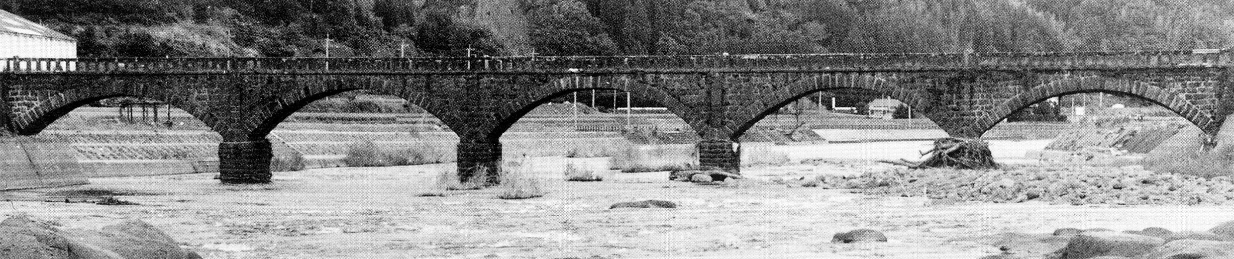 大野川流域の奥豊後一帯は石橋の宝庫である。現存する県内の505基というアーチ式石橋(歩道橋と水路橋とを合算)のうち、大野川水系では約40パーセント、200基を数えるのである。<原尻橋>大野川中流の「緒方五千五区」と呼ばれてきた豊沃な緒方平野では、山国川水系と同様、多連アーチ石橋が目につく。緒方川下流から見ていくと、鳴滝橋(五連、73メートル)、原尻橋(五連、73メートル)、長瀬橋(六連、78メートル)特に原尻の滝の上流に位置する原尻橋の端麗な容姿がすばらしい。これら三橋はいずれも大正11~12年の架橋で、当時、豊肥本線が大分市から逐次開通するにつれて物資の運送が必要になってきたためであると考えられる。
