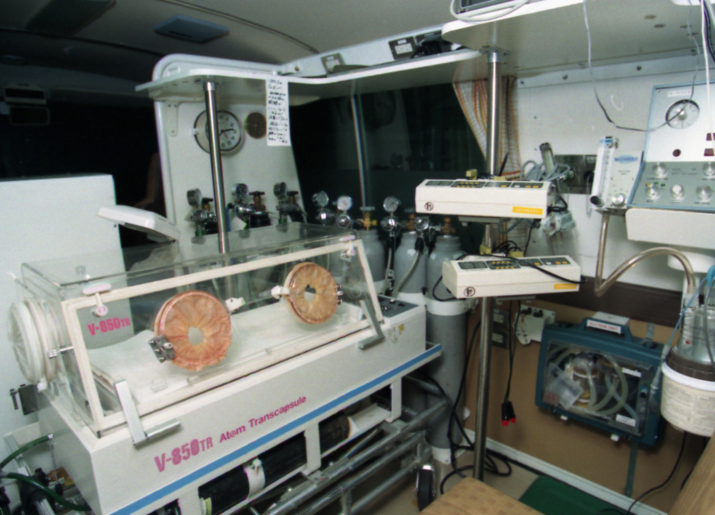 当時、大分県立病院には、未熟児などを搬送する新生児救急車(カンガルー号)が配置されていた。車内には保育器、人工呼吸器、呼吸心拍モニターなどが整備されており、医師が同乗して現地に急行し、生まれてすぐに救急医療を必要とする新生児に対して的確な初期治療が行われた。写真はカンガルー号の内部。