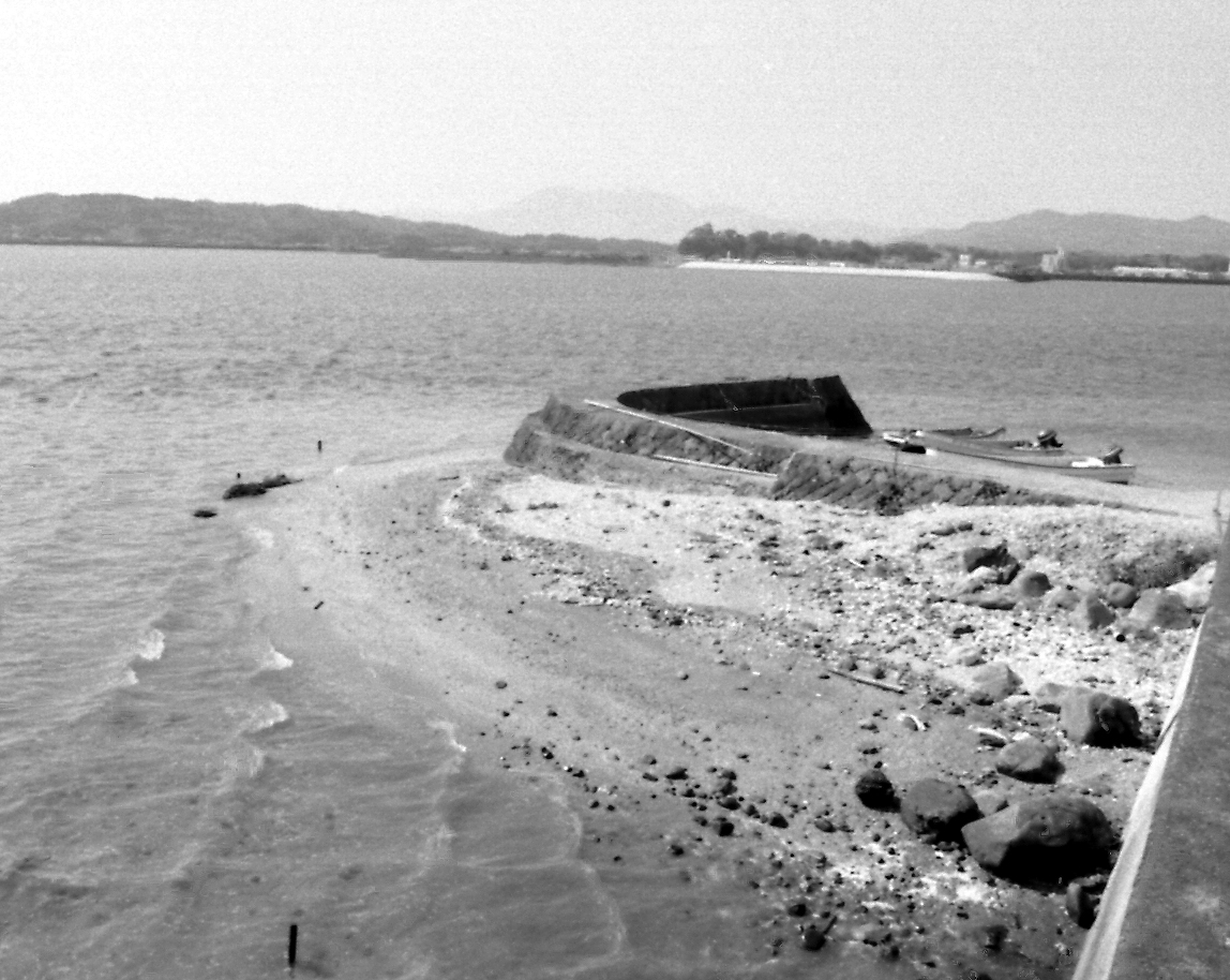 杵築湾が「生きている化石」カブトガ二の生息地として注目されていた。日本では瀬戸内海から九州北岸にかけて多く生息していたが、開発に伴う土地造成や海の汚染などから各地で次々と姿を消し、当時は杵築湾と伊万里湾など、ごく限られた場所にしか見られなくなったといわれた。写真はカブトガ二が生息する杵築湾・首捻り区域