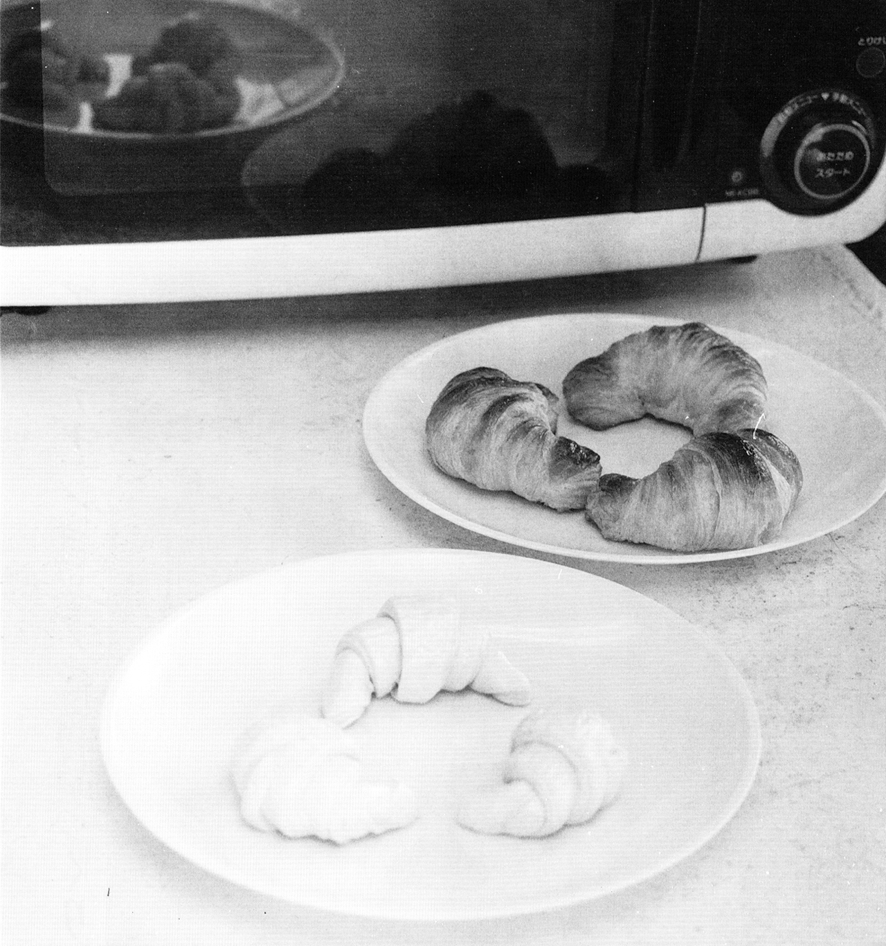 当時開発された、冷凍室から取り出された真っ白なコチコチのパン生地。これをオーブンに入れて約10分。コンガリふっくらのアツアツパンができあがった。宇佐パン粉(有)では、二次発酵の後直ちに冷凍。この状態で、各家庭への宅配販売を開始した。コチコチ状態のパン生地を家庭で焼き上げることにより、できたてのおいしいパンが食べられるようになった。