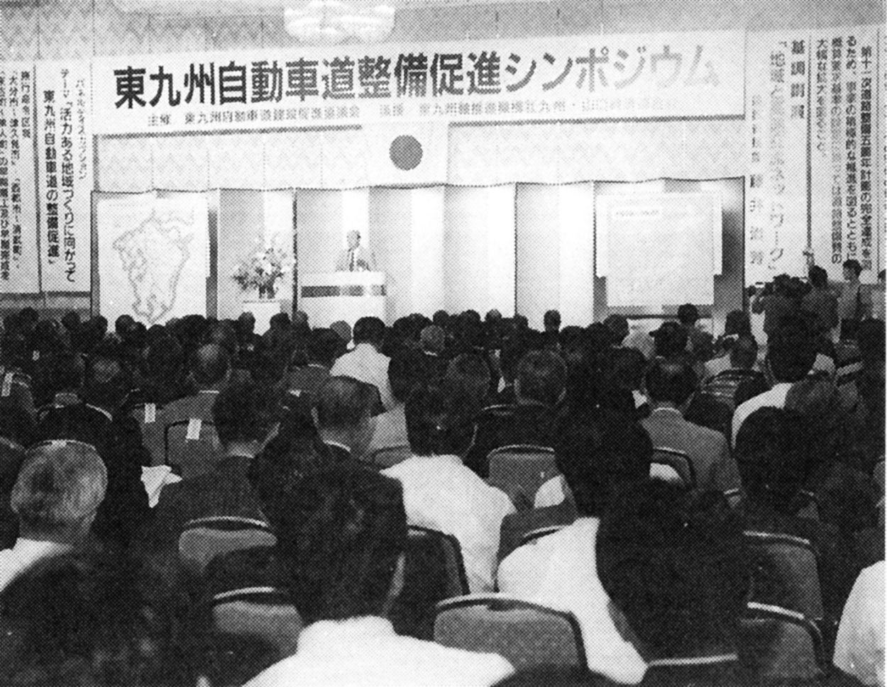 当時、東九州自動車道の早期全線開通に向けて世論を広く喚起しようと、東九州自動車道整備促進シンポジウムが平成6年7月25日、大分市の東洋ホテルで開催された。平松知事、松形宮崎県知事ほか将来沿線となる市町村、建設省、日本道路公団など関係者約1,000人が出席した。