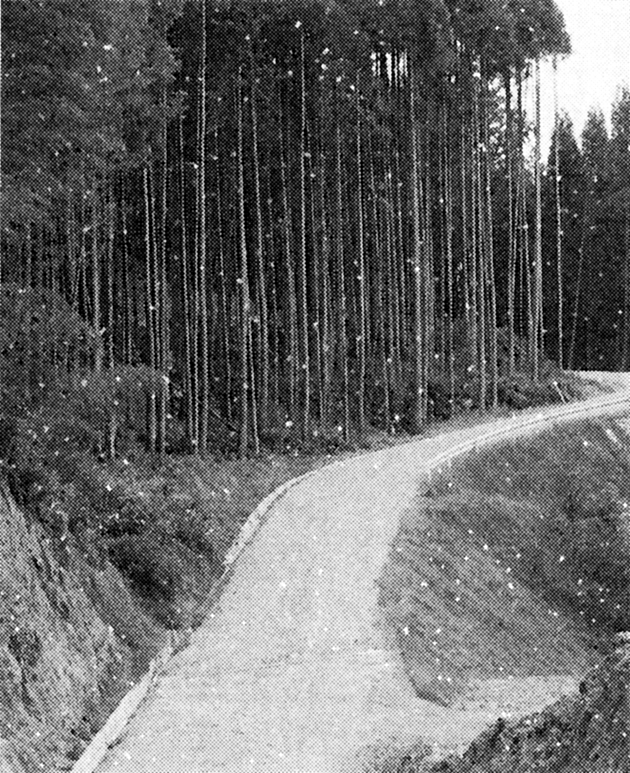 当時、県では国内の木材供給の75%を占める外材や、本県同様森林資源が充実しつつある他県産木材との競争に勝てるよう、原木の大量・安定供給に加え、低コスト・省力化を目指し、林道・作業道の整備、高性能林業機械の導入を積極的に推進していた。写真は整備された林業