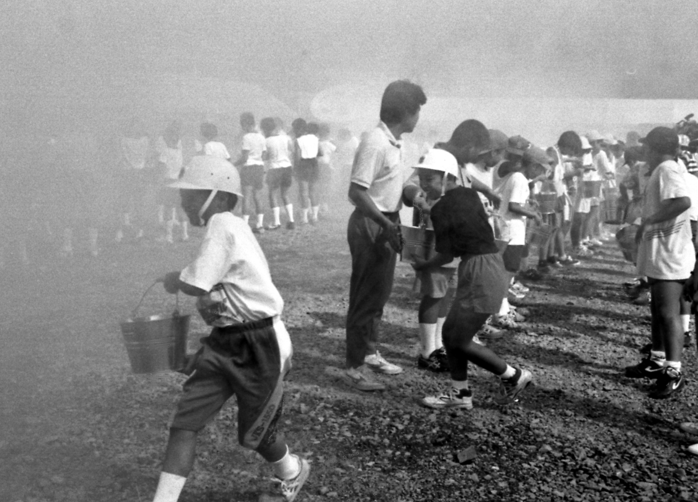 災害は忘れたころにやってくる。当時、万一の際の防災体制を整え、住民の防災意識を高めようと、大分県総合防災訓練が平成6年9月6日、佐伯市の佐伯総合運動公園で行われた。台風の通過後、さらに震度5の地震が発生。同市及び周辺の各地で山崩れ、崖崩れが起き、多数の負傷者が出たという想定。「急げ、急げ」。地元小中学生らによる水バケツリレーなどが行われた。