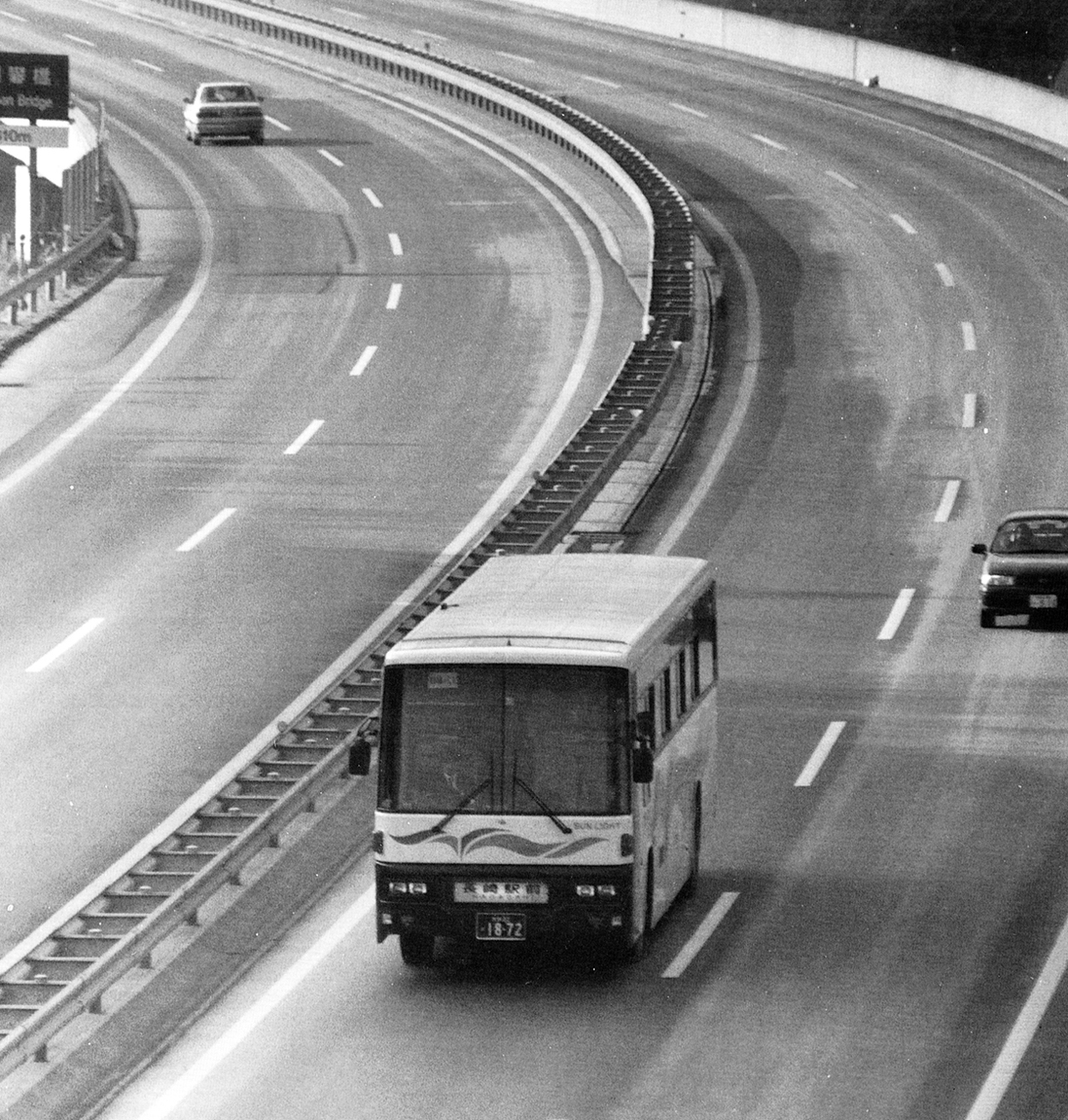 大分~長崎間を4時間で結ぶ29人乗り高速バス「サンライト」。当時、県内バス会社4社と県外3社の共同運行により、大分市と長崎市の間を7往復していた。長時間の乗車にも快適な旅行ができるよう、車内には、テレビ、ビデオ、トイレ、電話などのさまざまな設備が設けられている。平成7年3月の九州横断自動車道の日田~玖珠間開通で、さらに15分の時間短縮が予定されており、平成8年度の全線開通ではさらにスピードアップされることになっていた。