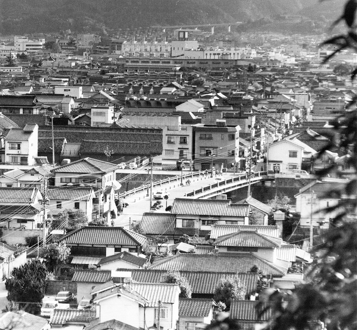 当時、日田市の中心商店街は近代化され、地方中核都市にふさわしい魅力を整えつつあった。江戸時代の情緒を残しながら個性的な町並みを勧めている豆田町、隈町が広がり、新しい町並みと古い町並みが見事に調和し、都会では真似できない厚みを作り出していた。月隈公園(日田代官所跡)から市街地を望む。花月川を隔てた向かいが豆田町。