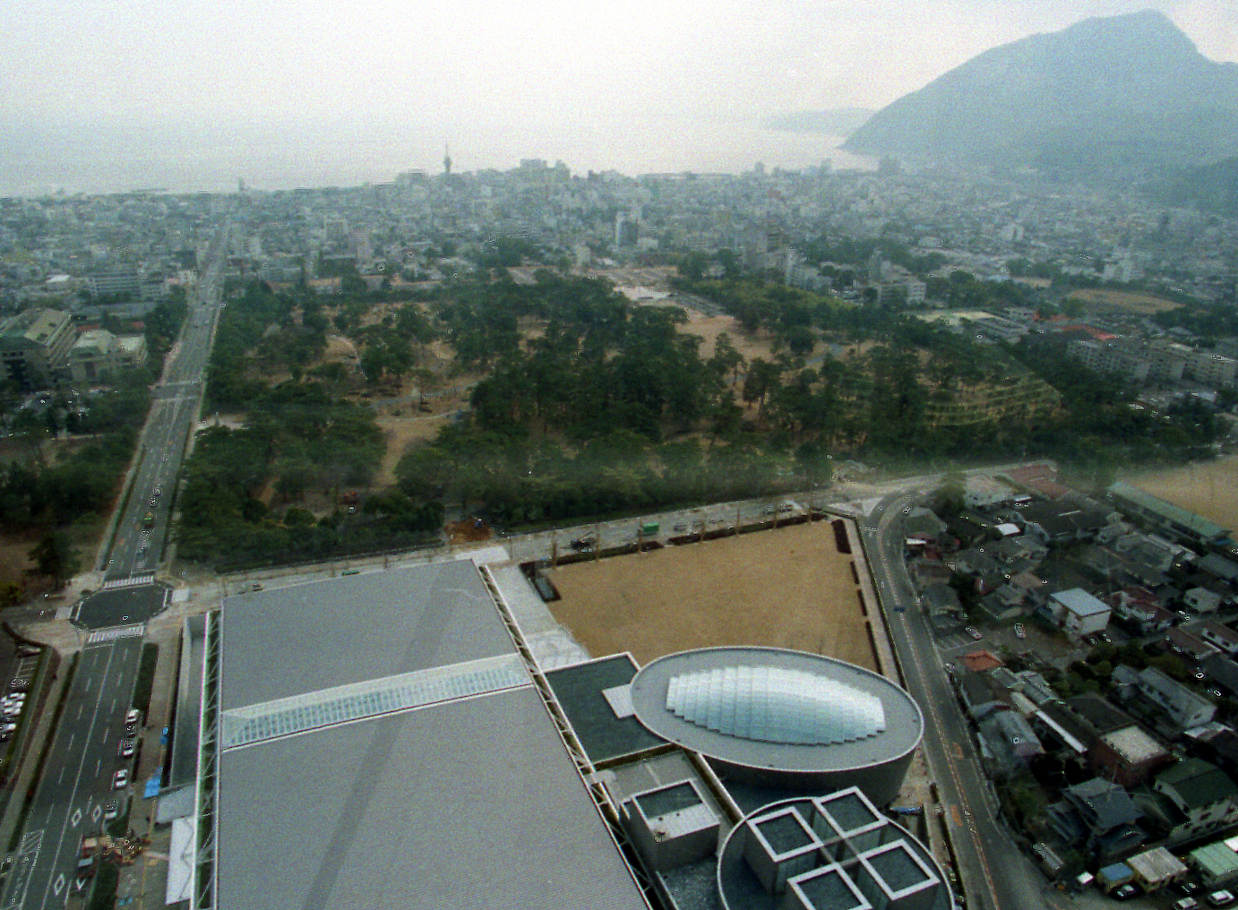 ビーコンプラザに建てられたグローバルタワーの高さは、125メートル。その100メートル地点に設置された展望台からの眺望。別府の美しい景色を一望できる。