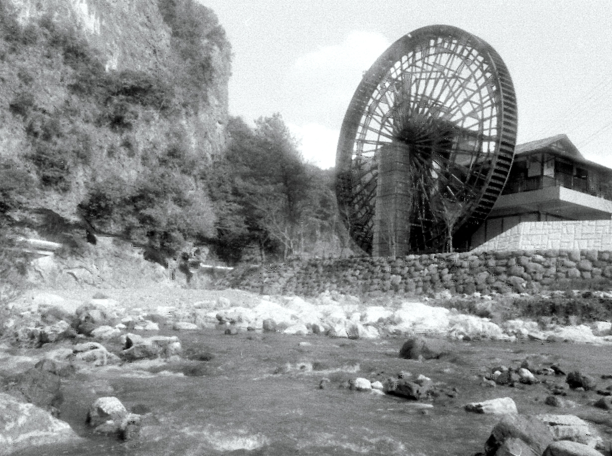 直径18.18メートル、水車幅1.39メートル、羽根板の枚数128枚。木造では日本一の水車である。