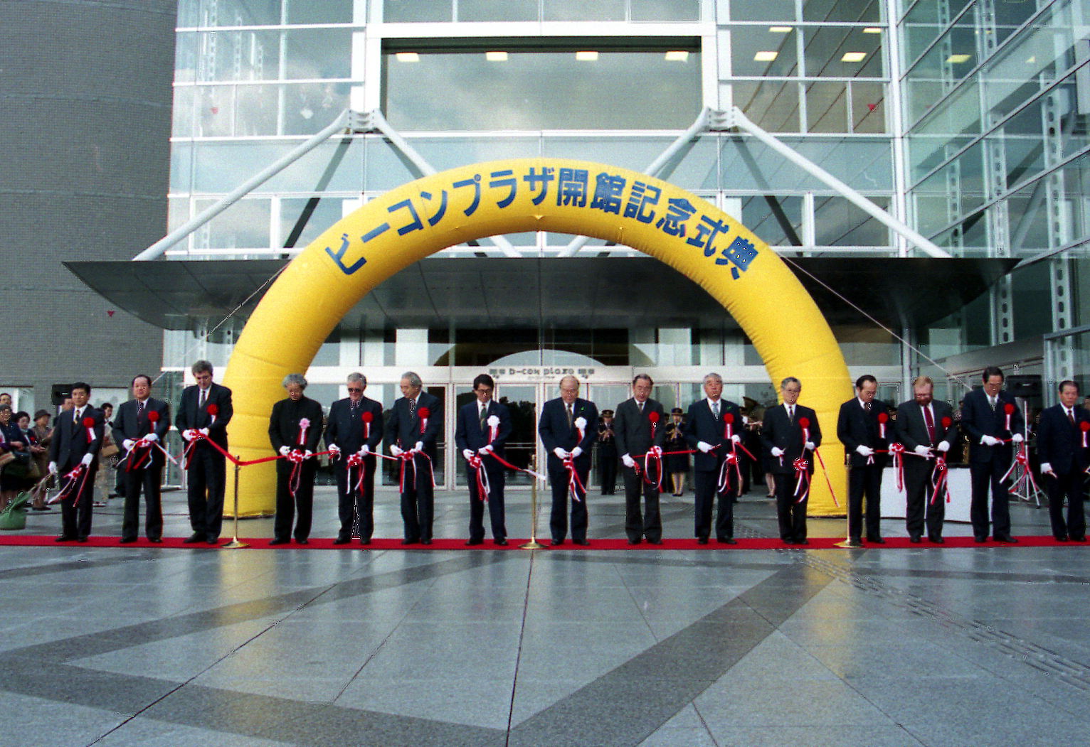別府市に建設された大型コンベンション施設「ビーコンプラザ」の会館記念式典が平成7年3月4日、市内をはじめ県内外から関係者約3,200人を集め開催された。平松県知事(当時)や中村別府市長(当時)のあいさつ後、村山首相(当時)やフィルハーモニアホール名誉音楽監督となった国際的なピアニスト、マルタ・アルゲリッチさんからのメッセージも紹介された。湯布院源流太鼓や郷土芸能、県警音楽隊の演奏などのアトラクションもあり、出演者は見物や館内見学を楽しんだ。