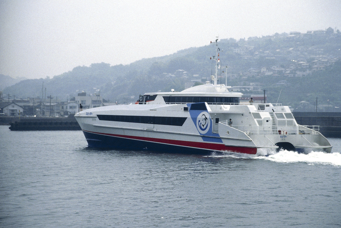 大分市と愛媛県伊予市を1時間45分で結ぶ超高速船スピーダーが平成7年7月7日から運行を開始した。伊予港から松山市までは11キロ、JRで約20分の距離。1日3往復のスピーダーの就航により松山までの日帰りの観光、ビジネスが可能になった。