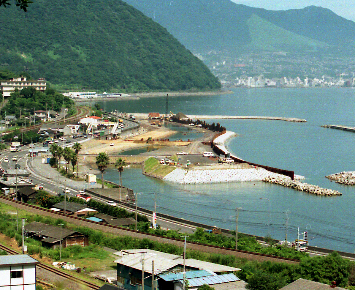 当時行われていた田ノ浦海岸環境整備事業は、別大国道の交通混雑解消をねらいとした6車線の拡幅工事にあわせ、新たに人工海浜や沖合に浮かぶミニ人工島をつくって、多く人が気軽に楽しめるレジャー基地として田ノ浦海岸を活性化しようとするものであった。