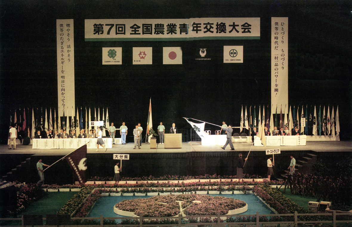 21世紀の担う全国の農業青年の集い、第7回全国農業青年交換大会が平成7年7月26日から28日までの3日間、別府市のビーコンプラザを主会場に開催された。26日は開会式。別府商業高校吹奏楽部のマーチにのって、大会旗、全国の都道府県連旗が入場。会場内は、全国から集まった農業青年ら約2,000人の熱気に包まれた。