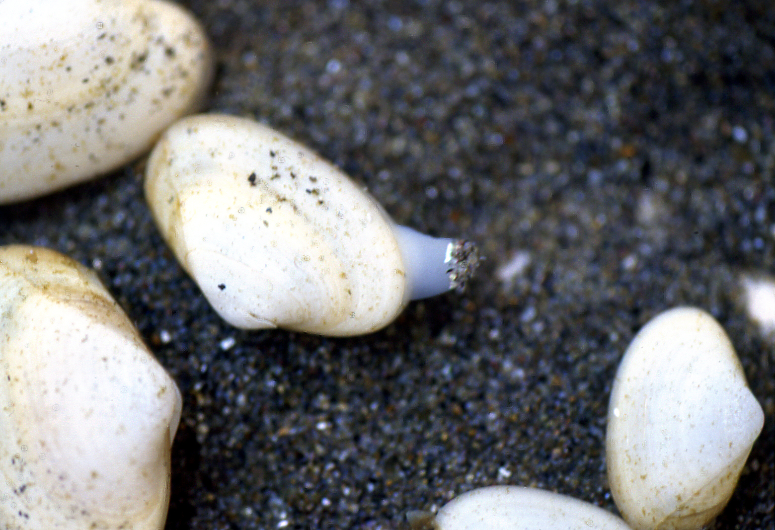 ミルクイは成体で殻長14~15cmにも達する巨大な二枚貝。バカガイ科に属する食用貝で、特に水管が太く、高級寿司のネタとして使われる。水深5~10メートルの改訂の砂地に潜って生息するが、軟らかい泥を好まないため、泥分7%以下の比較的潮の流れの早い地域に生息する。