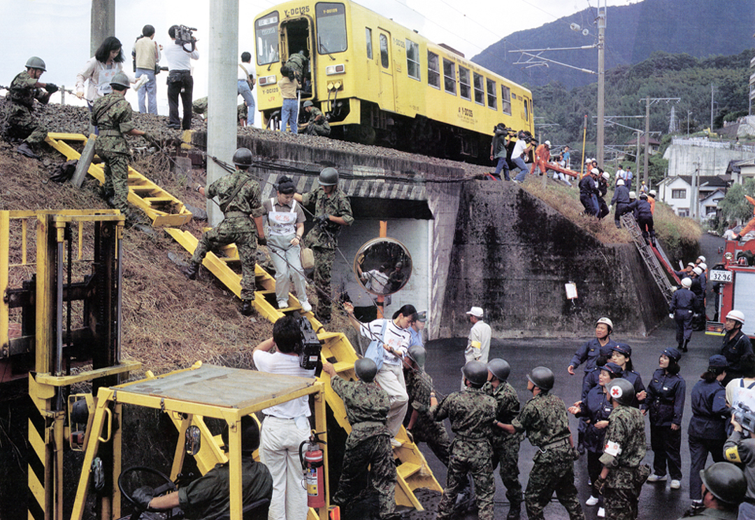 阪神・淡路大震災を教訓にした大規模な地震対策総合防災訓練が平成7年9月3日、別府市浜脇地区周辺市街地などで行われた。午前7時46分、別府市を中心に震度6(烈震)の直下型地震が発生、市内各地で家屋やビルが倒壊し、火災が起き、死者や多数の負傷者が出ていると想定したものだった。JR日豊本線では、電車が緊急停止、自衛隊のきびきびとした作業などにより、線路の高架部分にハシゴがかけられ、乗客30名を無事救助した。
