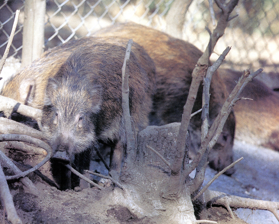 山の斜面を上っていくと、10頭余りの群れが走りおりてきた。土ぼこりをたて、すさまじい勢いだ。家畜化されたブタの親戚といわれるイノシシだが、やはりその姿は野生の生き物そのもの。そこは、佐伯市宇目上津小野の「宇目観光猪牧場」であった。当時、3ヘクタールの山林の周囲を策で囲み、約60頭の猪を自由に放牧させていた。町内に数多く生息する猪が町の活性化に一役かっていた。
