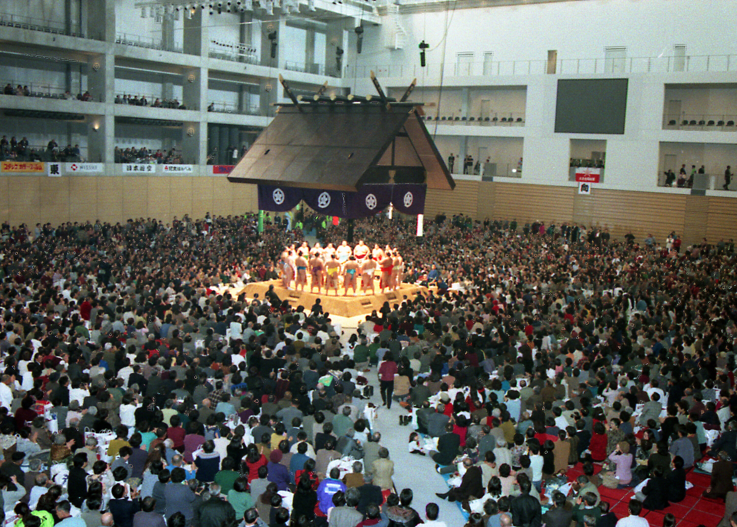 大相撲大分場所が平成8年12月5、6日の2日間、別府市のビーコンプラザで開催された。会場は、本格的な吊り屋根、マス席を設置し、まさに本場所さながらだった。若貴兄弟をはじめ、曙、武蔵丸、舞の海などの人気力士も勢ぞろいした。大分県出身の関取、琴別府や序二段の富永も大活躍した。会場に詰めかけた大勢の相撲ファンは、力士たちの熱の入った取組みやユーモラスな演技を心ゆくまで堪能していた。幕内力士の土俵入り。人気力士が土俵に上がると、一際大きな拍手が会場内に沸き起こった。