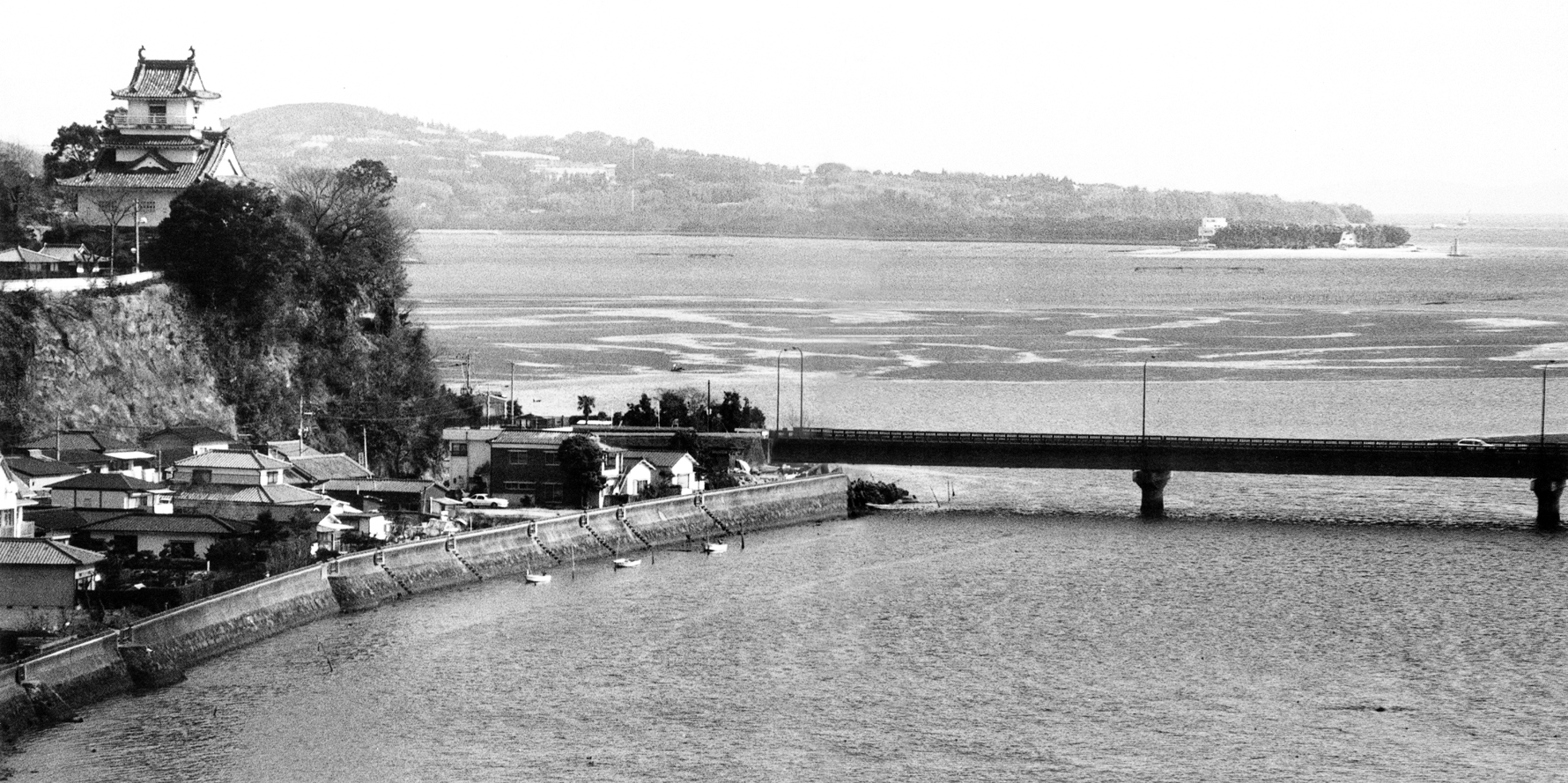 国道213号に面した杵築城の高台に立つと、眼前に守江湾が広がる。かつての杵築城は、三方を海に囲まれた海城であった。城の直下の八坂川の左岸には、今も、お舟手長屋と呼ばれていた江戸時代の水夫の住まいが残されている。