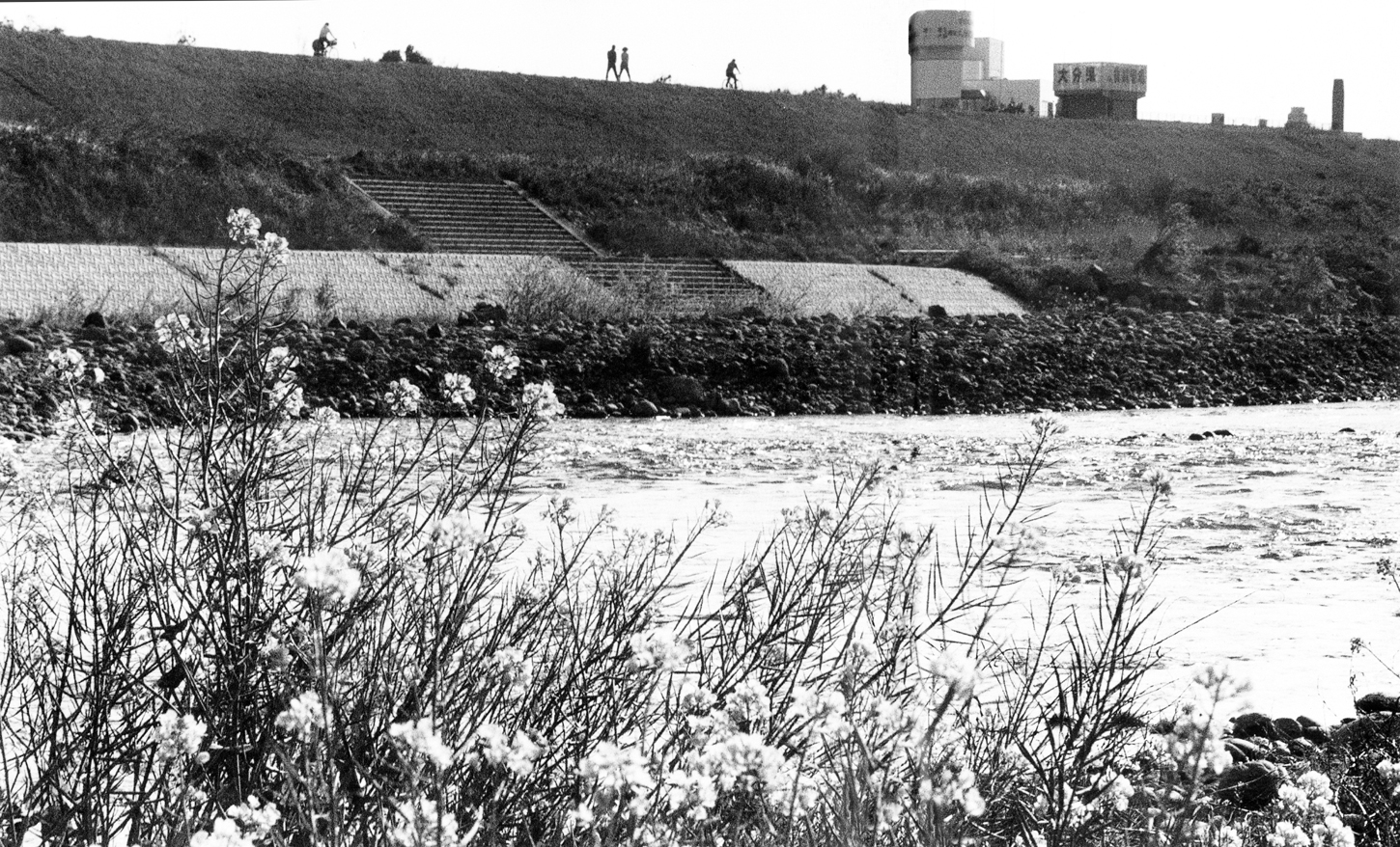 賀来中学校の前を流れる賀来川。9月1日に行われる賀来神社の仲秋祭の神事には、この賀来川でその日の早朝に取れた鮎が使われている。