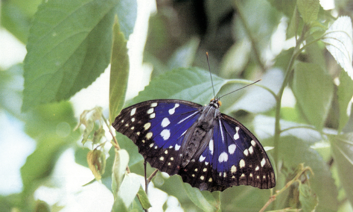 紫色の美しい羽を持つオオムラサキは日本の国蝶。タテハチョウ科に属する日本産のチョウの中では最大で、羽を広げたときの大きさは90ミリほど。オスはオオムラサキの名前のとおり羽の表面が紫色に輝くが、メスは灰褐色で地味。写真は当時、宇佐郡宇佐市院内町の上院内小学校で羽化したオオムラサキ。