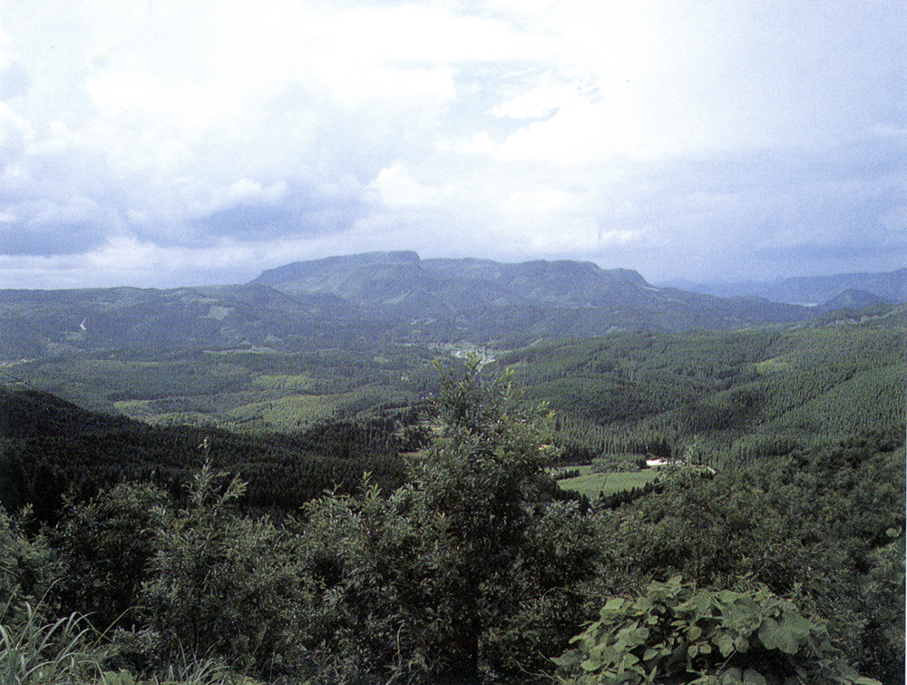 柴館峠は九重町の地蔵原から宝泉寺温泉に抜ける途中にある。地蔵原から続くなだらかな道を上ると、玖珠の象徴万年山の姿が目に飛び込んでくる。写真は、柴館峠から望んだ万年山。