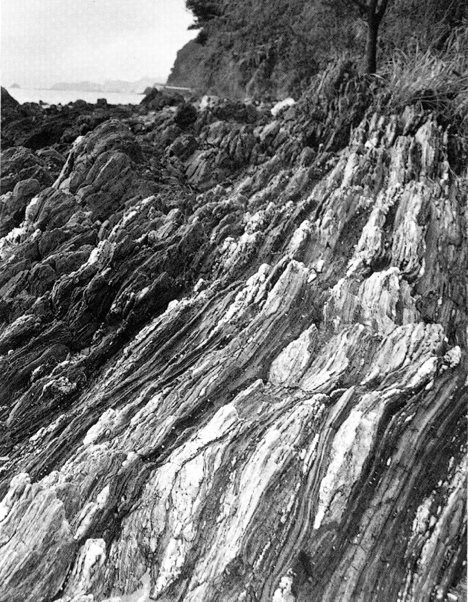 佐賀関半島の付近の海辺を歩くと、一定方向に波上の美しい曲線を描く縞模様の岩石を目にする。結晶片岩と呼ばれる変成岩の一種。3~1.5億年前、堆積岩などが地中深くで地殻変動の圧力を受けて性質が変化した岩で、結晶が一定方向に配列していて、一見書物のページを重ねたような形状で、平らに薄くはがれやすい性質を持つ。豊予海峡の海底も結晶片岩からなり、大分・愛媛両県を結んでいる。写真は、豊予海峡を渡って延びる結晶片岩の岩盤