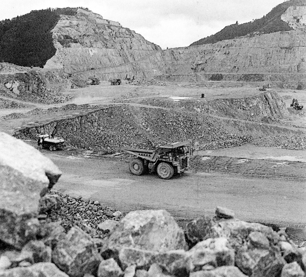 津久見市では日本一の石灰高山を見ることができる。幅1~2キロメートル、海岸から20キロメートルにわたって続き、当時の推定埋蔵量は45億トン。良質の石灰岩は白く輝く粒がきれいな乳白色の岩である。装飾用石材の大理石は、石灰岩が変性し再結晶したもので、成分は同じだから、きれいなはずだ。津久見産石灰岩は純度が高く、非結晶質塊状の超優良鉱である。写真は、胡麻柄山の採掘現場。