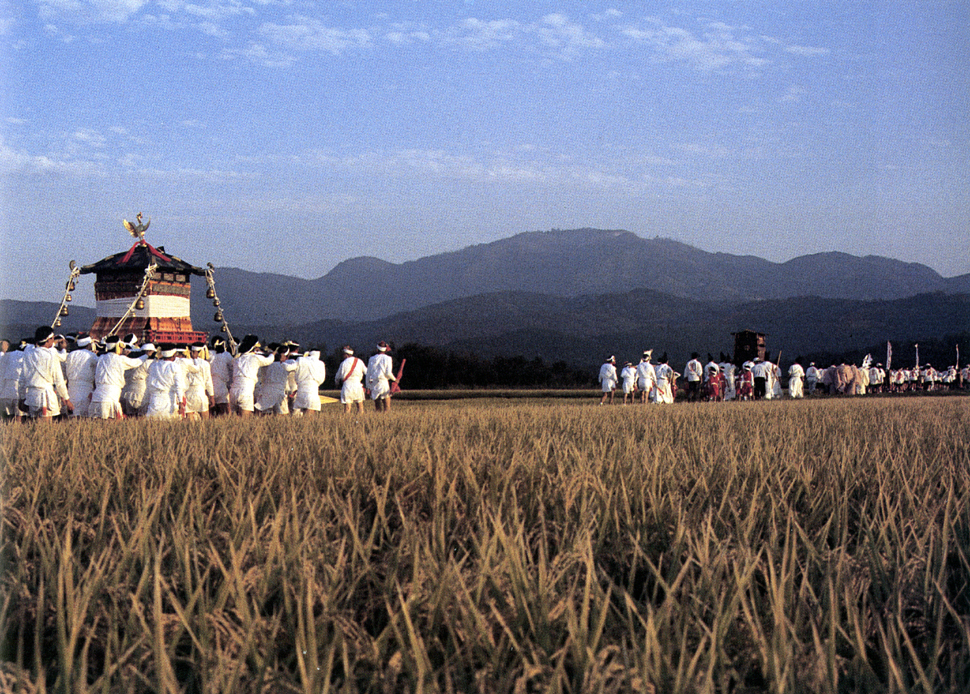 宇佐神宮の伝統行事「放生会(ほうじょうえ)」は県選択無形民俗文化財である。放生会には宇佐神宮から八幡神のご神体を載せた神輿(みこし)が、和間神社まで移動する「お下り」がある。道中は、稲穂が頭を垂れる実りの秋を迎えた田圃が広がり、この中を見越しの一段が進む。夕映えの光の中で見ていると、神々しく、豊作を無病息災を神に感謝する気持ちが自然にわいてくる。奈良時代の風俗を色濃く残す祭りは長く受け継がれていた。