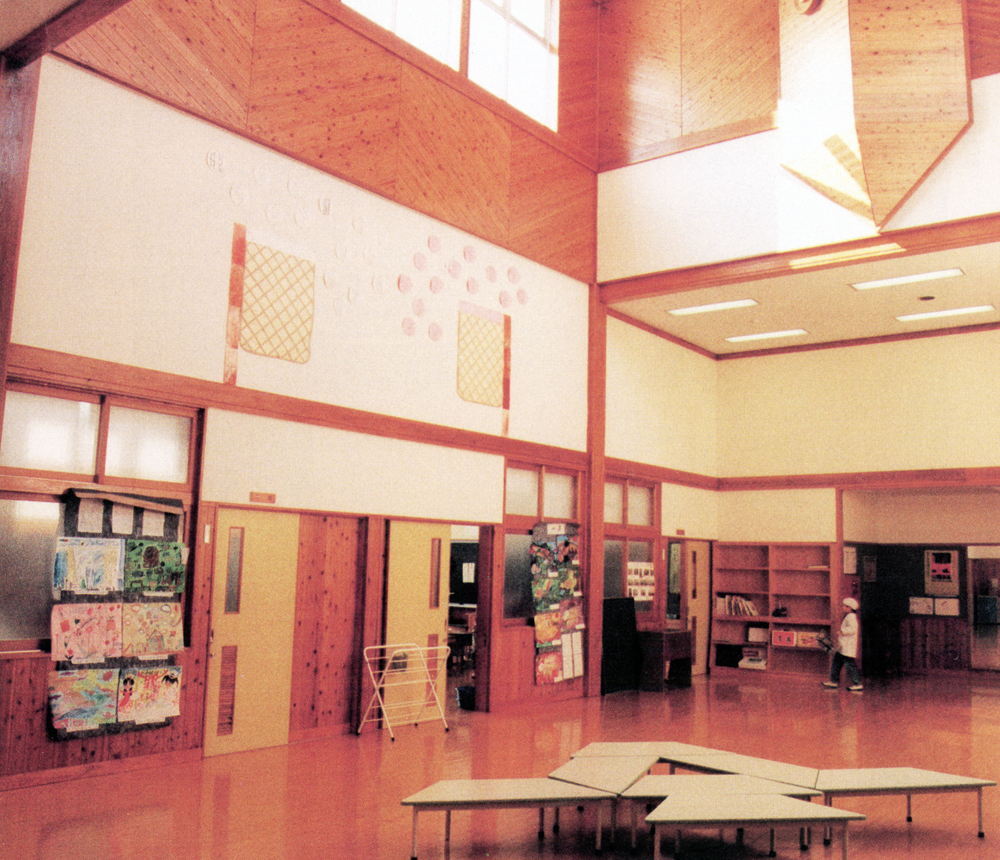日田市立小野小学校の校舎は、一部鉄筋コンクリート造の木造二階建。当時、建築に要した木材約349立方メートルは、すべて県産材を使用し、県の「豊の国大型木造施設建設等促進モデル事業」の対象となった建物だった。