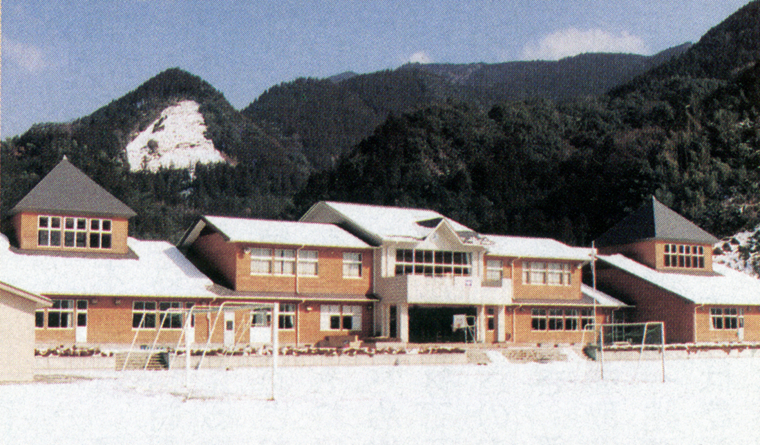 日田市立小野小学校の校舎は、一部鉄筋コンクリート造の木造二階建。当時、建築に要した木材約349立方メートルは、すべて県産材を使用し、県の「豊の国大型木造施設建設等促進モデル事業」の対象となった建物でだった。
