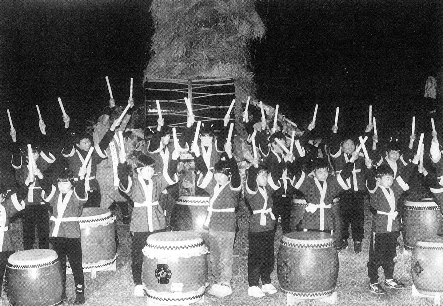 島の子太鼓の披露。ドンド行事は、昔から伝わる故郷の祭りの1つ。ドンド焼き、ドンドン焼きなど地方によって呼び方は異なるが、竹で組んだやぐらを、持ち寄った門松やしめ縄などの正月飾りとともに燃やして無病息災を祈願する、正月の恒例行事である。佐伯市の大入島では平成9年1月14日、「ドンド火まつり」が盛大に行われた。
